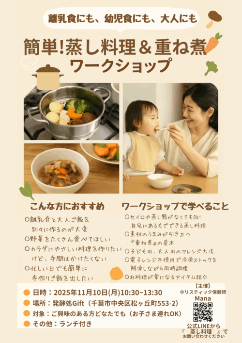 📝 内容:蒸し料理、重ね煮のデモンストレーションを中心に、お手伝いいただける方は、調理の一部をお手伝いいただくこともあります。